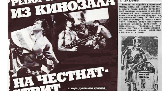 Советская критика часто подвергала разбору продукцию западного кинематографа. Забавно, что зачастую даже ту, которую советским зрителям увидеть было не суждено. При этом в число разносимых картин входили и признанные шедевры. Главным, а порой и единственным их грехом было несоответствие учению марксизма-ленинизма (которое, как известно, “всесильно, потому что оно верно”). “Умный журнал” вспоминает самые яркие критические стрелы, выпущенные в знаменитые западные фильмы отечественными бойцами идеологического фронта. Мудрые гномы с ослиными ушами Легендарный фильм Джорджа Лукаса удостоился отзыва в советской печати уже в год своего выхода - 1977. Произошло это в “Литературной газете”, где была опубликована заметка Юлии Варшавской под названием “Космические киноужасы”. Заголовок несколько странный, потому что хоррором “Звёздные войны” назвать трудно, но именно в таком ключе их пытались изобразить в СССР. Забавны были и описания героев картины советскими авторами. В упомянутой заметке Варшавской они перечислены так: «Некая круглолицая принцесса, деревенский юноша, старый рыцарь Круглого стола, человек-обезьяна и два робота. Один из них, громадный позолоченный робот Трипио, наделен человеческой речью, другой, Арту-Дету, похож на автомобиль и изъясняется „звездными“ сигналами». Или вот такой пассаж Александра Кукаркина из его книги “Буржуазная массовая культура”: «...мудрые гномы с шестью причудливыми пальцами на руках и ослиными ушами на головах, обладающие магической силой мыслью поднимать из болот засосанные тиной межпланетные корабли». А вот известный киновед Елена Карцева с обликом главного злодея фильма явно что-то напутала: «...Дарт Ведер, не расстающийся с рогатым шлемом, делающим его похожим на дьявола». О втором отрицательном персонаже она отозвалась шутливо: «...Мофф Таркин, угрюмый аскет в полувоенном френче, на котором, как наградные планки, размещены клавиши телекса». В той же книге “Голливуд: Контрасты 70-х” Карцева поделилась и другими мыслями насчёт двух героев: «Если созвучие имен — Дарт Ведер и Дар Ветер (человек коммунистического будущего из всемирно известного романа Ивана Ефремова „Туманность Андромеды“) — можно счесть случайным совпадением, то помощник главного злодея наделен куда более определенными чертами. У него русифицированная фамилия Таркин, а его внешний вид и одежда уже вполне явственно напоминают о коварных большевиках, какими они часто выглядят в антисоветских фильмах». Несмотря на вал критики, ещё при жизни СССР, в 1990 году, фильм Лукаса всё-таки добрался до советских экранов. К нему даже были нарисованы постеры, один из которых выглядел так: Больное воображение косноязычного идиота Ещё до того, как Сильвестр Сталлоне появился в фильмах с явным антисоветским уклоном, он уже удостоился критики в СССР. Казалось бы, за что критиковать первую часть “Рокки” - историю успеха простого парня пролетарского происхождения? А вот за что: «...создание подобной картины – весьма характерный пример того, сколь укоренилось в сознании и подсознании многих американцев упование на жар-птицу удачи, которая уж если и не прилетит к тебе в реальной жизни, то хотя бы на мгновение осенит крылом с киноэкрана». А уж когда Сталлоне стал сражаться с советскими офицерами во Вьетнаме (“Рэмбо: Первая кровь 2”) 