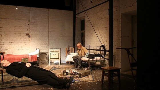 В 1970-е Юрий Погребничко играл в Москве в подпольных спектаклях по Пинтеру — "Сторож" и "Лифт" — режиссера Григория Залкинда, первопроходца театра абсурда в СССР, официально работавшим на телевидении, и чей след затерялся в истории. В 1989 году Погребничко ставит эту же пьесу уже в "Около" (помещая имя Залкинда на афише в графе "режиссер"), а позднее выпускает еще одну редакцию это тихого бессобытийного спектакля для троих актеров, один из которых — он сам.