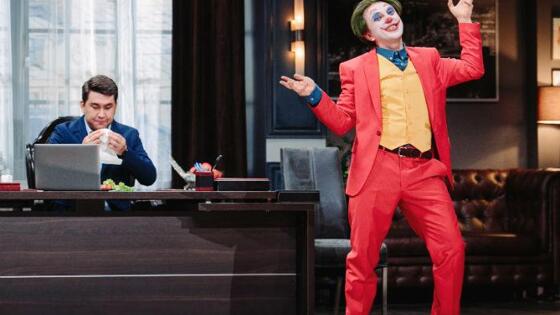 27 ноября на канале ТНТ выйдет новый выпуск комедийного шоу «Однажды в России». На сей раз артисты решили не мелочиться, а повторить сюжет самого нашумевшего фильма этого года - «Джокера». Как стало известно Teleprogramma.pro, на прием к мэру Азамату Тахировичу придет посетитель в красном пиджаке и клоунском гриме. Визитер расскажет чиновнику, что 28 лет назад его мать работала у главы администрации, следовательно, мэр - его отец. В качестве аргумента клоун принесет с собой пистолет, тогда Азамату Тахировичу можно будет прощаться с жизнью. Создатели шоу раскрыли секрет, что в их миниатюре, в отличие от картины Тодда Филлипса, появится взрослый Бэтмен. Чем закончится противостояние персонажей комикса и российского чиновника, зрители узнают 27 ноября в 21:00. больше по теме Прибыль заставила режиссера передумать: «Джокер» получит продолжениеТодд Филлипс договорился с Warner Bros. об еще одном фильме по комиксам DC. Кстати, кто будет играть Джокера, сотрудники ТНТ не рассказали, и предложили читателям Teleprogramma.pro самим определить актера под слоем грима. Как вы думаете, кто это? Неужто Хоакин Феникс? Джокер канала ТНТ. Кто же ты? Фото: канал ТНТ.