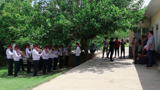 Музыканты военного оркестра в качестве подарка устроили персональный концерт во дворе дома ветерана. Они исполнили знаменитые композиции времен Великой Отечественной войны - «Катюшу», марш «Прощание славянки», «День победы»