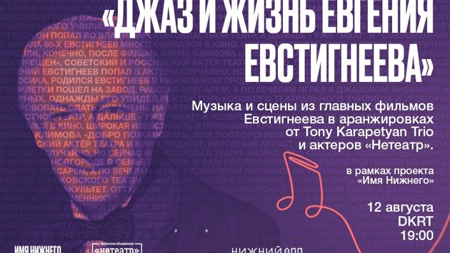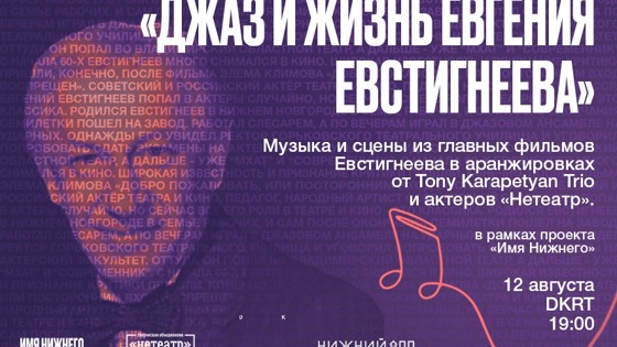 В программе «Джаз и жизнь Евгения Евстигнеева» — музыка и сцены из легендарных фильмов советского актера в джазовой аранжировке в исполнении TonyKarapetyanTrio и актеров независимого театра «Нетеатр».
