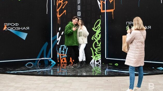 На фоне Дворянского собрания утвердились стрит-арт-художники — они рассказали, что работают тут с девяти утра, украшая строительный забор. Только один из них, Sly Dog, казанец. Остальные же иногородние — Григорий Taur и Денис Dendy из Санкт-Петербурга, Миша Vert — из Владивостока, Tony Stork — екатеринбуржец, а Висилий TSWET — из Костромы. Порой кто-то решался к ним подойти (в основном, дети), и художники помогали им, объясняя, как работают баллончики с краской.