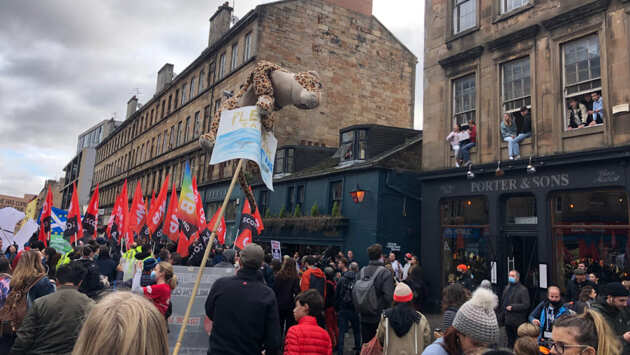 В потоке людей шли семьи, дети, собаки, ехали рикши с музыкальными колонками, из которых доносилась миролюбивая даб-музыка. Проплывали новые лозунги — «Бээмиксеры (BMX, тип велосипеда) требуют климатической справедливости», «Ниндзи против глобального потепления», «Борис(ь)!» и проч. Колонна протестующих растянулась на несколько километров — глазгианцы высыпали на улицы и завороженно смотрели на активистов, стоя у своих домов.