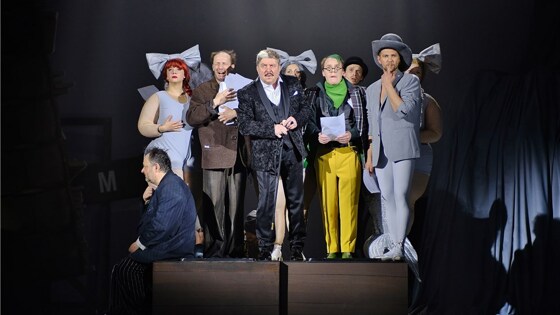 Водевиль «Лев Гурыч Синичкин», сочиненный Дмитрием Ленским в XIX веке на основе французского первоисточника, имел счастливую судьбу. В отличие от многих своих собратьев по жанру, этот водевиль остался в веках благодаря экранизации Александра Белинского и Алексей Бонди слегка переработал произведение Ленского, что дало пьесе очередную новую жизнь. Теперь же, спустя годы «Синичкин» вернулся на сцену Комедии – и опять в новой сценической версии, основанной на предыдущих вариациях. Однако сцены, герои и куплеты могут чередоваться сколько угодно, но основные мотивы остаются неизменными – актер Синичкин идет на всевозможные ухищрения, чтобы побороть провинциальных недотеп и помочь своей талантливой дочке получить дебют на сцене. Интриги, театральная изнанка, чистый образ героини и торжество добра остаются неприкосновенными. Меняется форма, благодаря чему старинный водевиль смотрится, как только что написанный. В премьере Виктора Крамера известный сюжет обрел форму музыкально-драматической фантазии (композитор Сергей Ушаков, текст песен Вадима Жука). Идею театрализации и игры режиссер берет за главную - и многократно ее преумножает. Условность театра здесь на каждом шагу: огромная театральная машинерия выдвинута на авансцену, ряд зрительских кресел поставлен вертикально, манерность артистов (героев спектакля) жирно подчеркнута, нелепость режиссера Налимова (Александр Корнеев) и вальяжность антрепренера Пустославцева (Владимир Миронов) – тоже. По сюжету, чтобы помочь дочке, Синичкин посещает то ведущую актрису театра Сурмилову, то драматурга Борзикова, то попечителя Зефирова. Спектакль построен так, что при каждом визите герой погружается в мир персонажа, максимально отражающий сущность хозяина. Виктор Крамер, будучи не только режиссером спектакля, но и автором сценографии, очень плотно соединил внешнюю картинку с сущностью своих героев. Для Ирины Мазуркевич ее Сурмилова прежде всего прима. Актриса-Раиса и разговаривает свысока, и держится вальяжно. Чтобы подчеркнуть раздутое эго Раисы Минишны, режиссер помещает ее внутрь огромной статуи, в которой Сурмилова и передвигается. Статуя – ее трон, пьедестал, а еще – нелепая конструкция, рядом с которой прима выглядит маленькой и забавной. Много значит оформление и в характеристике других персонажей. Виталий Кузьмин играет драматурга Борзикова как ботаника с манией величия, считающего себя гением всех времен (актер за эту роль номинирован на премию «Золотой софит-2021»). Вокруг него по всей сцене лежат кипы бумаг, куда ни глянь – везде сочинения. Даже пишущая машинка у него – «живая». Среди всех этих фолиантов и устройств самого Борзикова отыскать трудно - «библиотечная крыса» вместо великого писателя. Граф Зефиров – местный аристократ и поклонник искусств. В исполнении Игоря Лепихина он увлечен живописью до беспамятства. И это его увлечение доведено Крамером-сценографом до крайности – по всей сцене развешены абстрактные картины Зефирова, «написанные» телами натурщиц и … лишенные всякого смысла и эстетической ценности. Князь Ветринский (Алексей Красноцветов), мечтающий завладеть дочерью Синичкина, имеет свой опознавательный знак – донельзя обтягивающий костюм с пряжкой в виде кролика–«плейбоя». В этом весь Ветринский – вертлявый, как на шарнирах, постоянно любую