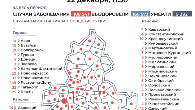 Ростовская область, 22 декабря 2021. DON24.RU. Суточный прирост зараженных ковидом зарегистрировали в 53 из 55 муниципалитетов Дона. Об этом сообщили в Правительстве Ростовской области. Больше всего заболевших за сутки выявили в Ростове (149), на втором месте расположился Таганрог (32), на третьем – Шахты (25). Ни одного нового случая заражения коронавирусом не выявили в Советском и Обливском районах Дона, а в остальных – от 1 до 21. За сутки в донских лабораториях провели 11 534 теста на ковид. За время пандемии их число уже превысило 5,1 млн. Также за сутки 22 жителя Дона умерли от ковида.