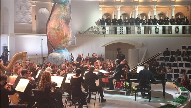 Оригинальная разнообразная программа вечера выглядела истинно щедрым угощением для гостей, пришедших поздравить именинника в Концертный зал им. Чайковского. Друзья-музыканты всегда почтут за честь принять приглашение Маэстро выступить на концерте в день его рождения. А на фоне печально ковидной диеты увидеть на праздничном столе, то бишь на сцене, звезд из Германии, Финляндии, да и многих российских артистов – дорогого стоит. "Каммерзенгер" бас Рене Папе, гобоист Альбрехт Майер, пианист и композитор Олли Мустонен, скрипач Сергей Крылов, домристка Екатерина Мочалова приняли участие в программе. Юрию Башмету дарят цветы. Юрий Башмет – выдающийся музыкант, артист высшего эшелона. Впервые в истории свой инструмент альт он вывел на мировую концертную эстраду в качестве сольного инструмента, колоссально расширив репертуар и исполнительские возможности. Масштаб артистической личности Башмета проявляется во всем. Но безоговорочную любовь публики Маэстро снискал не только своим мастерством. Юрий Абрамович – это тонна человеческого обаяния, тонкий юмор, всеобъемлющая доброжелательность, приветливость и неповторимая улыбка. А еще Башмет – это огромная ответственность за будущие поколения российских музыкантов, которым он без устали передает свой опыт. Ежегодно на День рождения Маэстро собирается полный аншлаг. Башмет – радушный хозяин, всегда готовит что-то особенное и захватывающее для публики. Его давний единомышленник и соратник режиссер Виктор Крамер, как говорится, тот еще придумщик, всегда фонтанирует оригинальными идеями. На этот раз сценографическое решение постановщик нашел в искусстве балансирующих камней. Композиция из настоящих камней, отражающихся в водном резервуаре, встречала входящих в фойе. На сцене же высились огромные имитации сложенных валунов, которые одновременно служили фоном для видеоарта. Эта символика давала зрителю простор для всевозможных аллюзий и метафор с музыкой. Теги можно выбрать разнообразные: философия, медитация, гармония, сложность, конструкция, форма, уравновешенность, точка сечения и т.д. Искусство суть баланс этих понятий. Балансирующие камни. Когда зазвучала первая композиция концерта "Норвежская народная мелодия" Эдварда Грига декорация тонко вписалась в музыку фьордов, "шумя" ветрами и волнами, наполняясь звуками троллей. И, конечно, именинник Юрий Абрамович занял место дирижера за пультом своего Камерного ансамбля "Солисты Москвы", обладателя премии Grammy. Все солисты концерта, безусловно, стали украшением вечера. Башмет подарил московской публике выступление несравненного вокалиста, солиста Берлинской оперы, двукратного лауреата Grammy, обладателя почетного звания "Каммерзенгера" Рене Папе. Певец исполнил цикл Модеста Мусоргского "Песни и пляски смерти" в переложении для голоса и камерного оркестра на русском языке. Солист Берлинского филармонического оркестра, трижды лауреат премии ECHO-Klassik Альбрехт Майер исполнил Мотет "Exsultate, jubilate" Моцарта в переложении для гобоя и оркестра. Наш прославленный Сергей Крылов, победитель международных конкурсов, обладатель золотой медали "Viotti d'Oro", блестяще рапсодировал на скрипке в "Цыганке" Равеля. Представительница русских народных инструментов Екатерина Мочалова исполнила на домре "Шесть румынских народных танцев" Бартока под руко