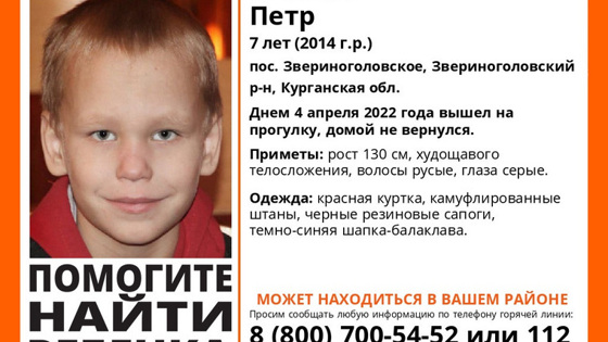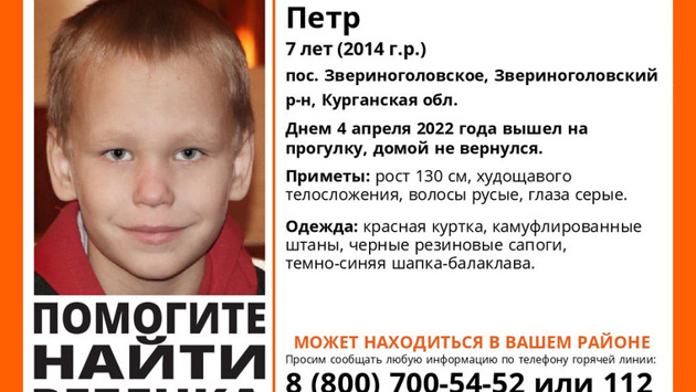Семилетний Петр Очнев пропал днем 4 апреля в Селе Звериноголовское. Ранее URA.RU сообщало, что к поиску мальчика присоединились добровольцы из Тюмени и Челябинска, так же к поиску подключили водолазов и беспилотный летательный аппарат. Возбуждено уголовное дело по статье «убийство». Всех, кому что-либо известно о местонахождении ребенка, просят сообщить информацию в дежурную часть УМВД 42-12-98, по «02», номеру 112, на горячую линию отряда «ЛизаАлерт» 8(800)700-54-52.