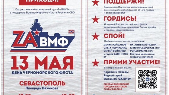13 мая, в День Черноморского флота, в Севастополе на площади Нахимова пройдет патриотический концерт «Zа ВМФ!». Об этом сообщают в местном Департаменте культуры. Данное мероприятие даст старт целому концертному туру по ряду городов. Севастопольцы смогут объединиться с российскими артистами, чтобы поддержать защитников Отечества, сражающихся за правду и справедливость. Гостей мероприятия ждут: — выступления артистов: Денис Майданов, Ольга Кормухина, ST, Сергей Войтенко и другие; — акция «Кораблик победы», где участники напишут письма российским солдатам; — акция «Родной Герой», в рамках которой жители могут записать короткий ролик о своем герое-моряке – лучшие из них будут использованы в концертной программе. Мероприятие начнется в 17:00, концертная программа в 19:00.