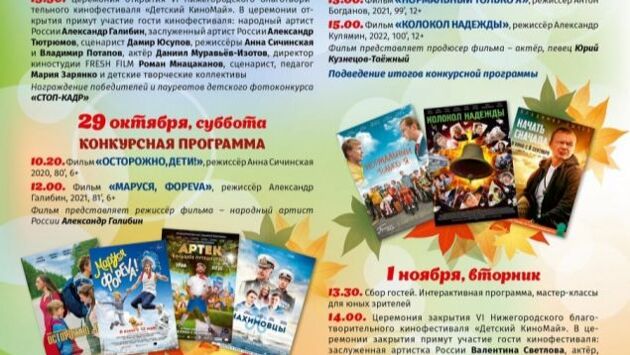 В библиотеке имени А. С. Попова Приокского района пройдет показ документально-постановочного фильма «Крылов. Реальность и вымысел». 30 октября команда КиноМая вместе с волонтерским театром кукол МТС «Мобильный театр сказок» отправится в Дзержинский санаторный детский дом, а 31 октября в Нижегородской областной детской библиотеке даст мастер-класс заслуженная артистка России Валентина Светлова.