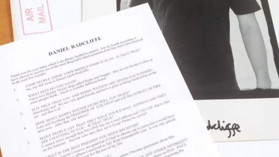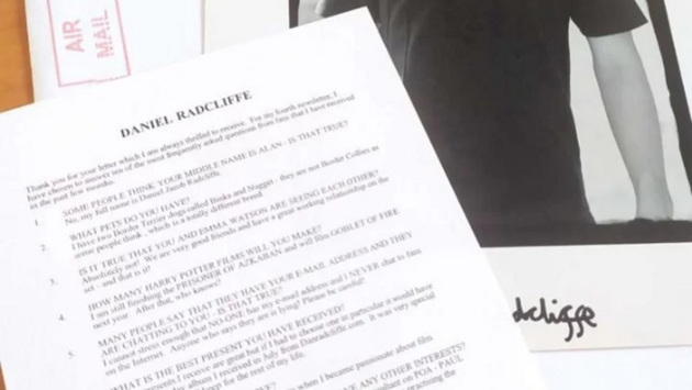 В письме Дэниэл Рэдклифф ответил на вопросы о себе. Он написал, что является хозяином двух йоркширских терьеров, любит слушать группы Blur и Muse, уважает актера Гэри Олдмена. Также исполнитель роли Гарри Поттера пожелал пермячке счастливых новогодних и рождественских праздников. Автограф на фото, письмо и конверт их хозяйка продает за пять тысяч рублей.