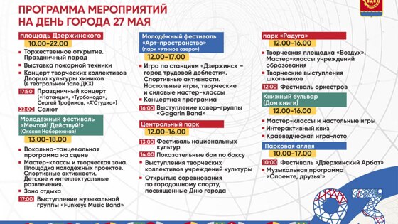 В День города, который состоится уже в следующую субботу, в Дзержинске будут работать 7 праздничных площадок. По традиции основной станет площадь Дзержинского, где утром пройдет торжественный парад с участием силовых структур, промышленных предприятий, учреждений образования, культуры и спорта. Здесь же вечером состоится большой праздничный концерт от «А’Студио», Сергея Трофимова, групп «Турбомода» и «Натанцы». В течение дня жителей и гостей города ждут 5 фестивалей: молодежные фестивали «Мечтай! Действуй!» и «Арт-пространство» на Окской набережной и в Утином озере, Фестиваль национальных культур в Центральном парке культуры и отдыха, Фестиваль оркестров в Радуге и арт-фестиваль «Дзержинский Арбат» – новая площадка на Парковой аллее. Там можно будет не только приобрести изделия дзержинских мастеров, но и попробовать свои силы в мастер-классах. Библиотеки города традиционно приглашают гостей на «Книжный бульвар». Полная программа празднования Дня города доступна на сайте администрации Дзержинска в разделе «День города». Программа может быть дополнена и скорректирована, следите за обновлениями.