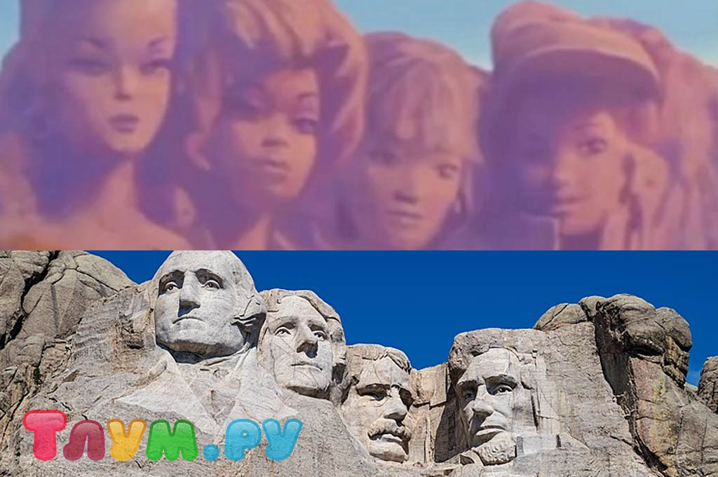 Гора Рашмор — одна из самых известных достопримечательностей США, которая находится в горном массиве Блэк-Хилс, юго-западнее города Кистон в Южной Дакоте. На ней изображены лица Отцов-основателей США. Конечно, «Барби» не могла обойтись без отсылки на неё — в Барбиленде тоже есть такая гора. А кто же на ней высечен? Давайте разбираться. Первая — оригинальная Барби 1959 года, вторая — оригинальная Кристи 1968 года, первая темнокожая кукла в линейке Barbie, третья — Восточная Барби 1981 года, первая азиатская Барби, и последняя — Калифорнийская Мечта Тереза 1987 года, первая латиноамериканская кукла в линейке. Получается, действительно основательницы.