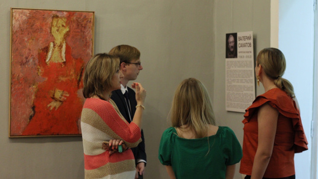 Картины Валерия Сахатова декоративны. Во многом они созданы под влиянием изучения узоров на туркменских коврах. Рисуя образы своих персонажей, автор менее всего думает о том, чтобы передать портретное сходство. Лица людей на этих картинах не выписаны, их черты только намечены. Фоном служат яркие цветовые потоки за спинами персонажей. Чаще всего художник не сообщает зрителю, кого именно он изобразил. Как правило, подписи довольно общие: "Мужской портрет в черном", "Грустный мальчик", "Детский портрет", "Подросток". И лишь иногда названия сообщают об образе жизни персонажа: "Сельский батюшка", "Консьержка", "Рязанская львица". Но при этом с помощью колорита и других художественных средств Валерию Сахатову удается передать свое представление о характере и судьбе того человека, которого он изображает. А в соседнем зале можно увидеть работы иллюстратора издательств "Детгиз" и "Советский писатель" Евгения Расторгуева.