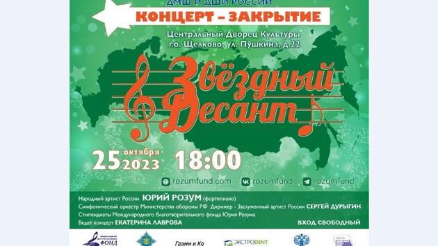 Торжественный концерт-закрытие Всероссийского музыкального фестиваля "Звёздный десант" состоится 25 октября в 18.00 на сцене Центрального дворца культуры Щёлково. В программе прозвучат шедевры мирового музыкального наследия. Стипендиаты Международного благотворительного фонда Юрия Розума София Фёдорова (меццо-сопрано) и Андрей Похлебаев (скрипка) вместе с Симфоническим оркестром Министерства обороны РФ, дирижёр - заслуженный артист России Сергей Дурыгин, перенесут гостей торжественного вечера в музыкальный мир сочинений Моцарта, Бизе и Сен-Санса. А в завершении концерта народный артист России, пианист Юрий Розум исполнит на сцене щелковского Дворца культуры знаменитый Первый концерт П. И. Чайковского. Ведет концерт Екатерина Лаврова. "Хочется просто сделать яркое событие, яркий музыкальный подарок для Щелково. Это родной город для нашего фестиваля, наша колыбель – школа имени Розума в Загорянке, которую удалось спасти от закрытия, да и сам Фонд Розума возник, чтобы спасти эту школу – и теперь она одна из лучших во всём Подмосковье", - говорит народный артист России Юрий Розум. Вход свободный.