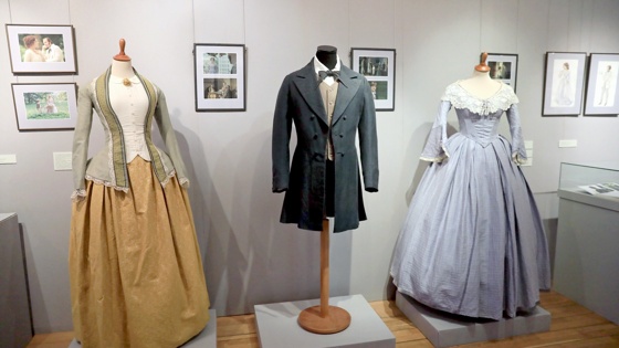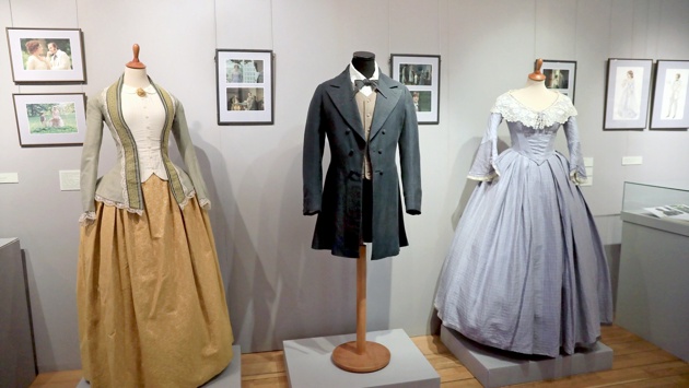 "Когда мы нарядили актеров в подлинные костюмы XIX века и начали снимать в саду - это выглядело как опера днем", - вспоминал работу в фильме "Отцы и дети" его сценарист и художник Александр Адабашьян. Режиссеру "Отцов и детей" Евдокии Смирновой, "Двух женщин" (у Тургенева - "Месяц в деревне") Вере Глаголевой хотелось приблизить своих героев к современности, а не опускать их в глубину позапрошлого века. Костюмы героев "Двух женщин" в первом зале иллюстрируют такой подход - у платья Елизаветы Богдановны низкая талия, широкая юбка по моде второй половины XIX века, а студент Алексей Беляев появился перед героинями в приталенном сюртуке и бабочке.