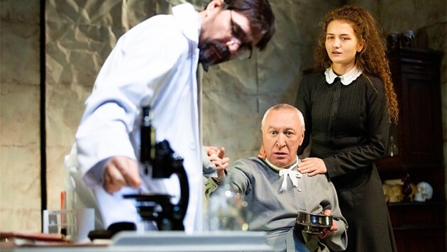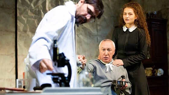 Вы входите в зрительный зал и оказываетесь почти что в операционной, где хирурги долго и по всем правилам моют руки, а затем начинают операцию – подробно, вдумчиво, кропотливо. И действие спектакля в основном идет столь же вдумчиво и кропотливо, словно стараясь перетянуть фантастическую прозу Булгакова в категорию реальности, заставить поверить в будничность происходящего. Вот профессор Преображенский ( Константин Телегин ) выпивает рюмочку водочки, сальными глазками провожает распустившую волосы кухарку Дарью Петровну (Елена Дриневская). Благородный доктор Борменталь (Павел Поляков) зашивает рану, нанесенную ему Шариком, досконально соответствуя хирургическим требованиям. Поет свои похабные частушки убитый в драке Клим Чугункин (Александр Жуликов), ставший донором для славной собаки Шарика… А вот и сам Шарик – прооперированный, поначалу в бинтах больше похожий на мумию, чем на человека, рождается на наших глазах Полиграф Полиграфович Шариков (заслуженный артист РФ Владимир Лемешонок). Поначалу неловко натыкается на столы и стулья, учится ходить и разговаривать. Потом все увереннее отстаивает "свои права" в квартире доктора, даже невесту приводит. Очень реалистичная, почти бытовая история. Про фантастическую составляющую забываешь очень быстро, да и с фильмом Бортко спектакль на малой сцене "Красного факела" перекликается мало. И Швондер Дениса Казанцева не такой угрожающий, и профессор Преображенский Телегина – отнюдь не рыцарь науки и нравственный ориентир. Обычный человек со своими слабостями и недостатками… - Когда перечитываешь книгу, открываешь для себя новые связи между смыслами. Фильм Бортко внес в русскую культуру архетипы Преображенского, Шарикова, Борменталя. Но мы же ставим не по фильму, — рассказывает режиссер Роман Габриа. – Собачье сердце для меня – это сердце собаки, и в этом нет иронии, а есть сострадание. Работая над спектаклем, я попрощался с фильмом и начал с чистого листа. Профессор Преображенский – гений, об этом говорят все, у него прямой телефон к таким высоким чинам, что наглый Швондер и полемизировать не смеет… Но, глядя на его пациентов – экзальтированную молодящуюся кокетку (заслуженная артистка РФ Виктория Левченко) и озабоченного сексуальной жизнью старичка (Ростислав Самусев), о величии науки думаешь меньше всего. Не стоят их мелкие радости страданий приличной собаки… - Единственный, кому в этой истории я могу сочувствовать – это Шарик, он единственный ни в чем не виноват, — говорит Роман Габриа. – Не надо вторгаться в природу, потому что большое ДНК природы рушится, когда в нее вмешиваются. К счастью, Борменталь настоял на новой операции, все вернулось на круги своя. Дремлет у миски довольный Шарик, кокетничает с очаровательной ассистенткой профессора Зиночкой (Карина Овечкина) Борменталь. Кружит в танце свою кухарку профессор… мир в этот раз вроде бы устоял. Здесь и сейчас, на уровне бытовой реальности. В этой петербургской квартире, в начале прошлого века. Но мы-то знаем все про прошедший двадцатый век, да и двадцать первый начался очень уж бурно. Кто может себе представить, какие опыты ставят сегодня люди?..