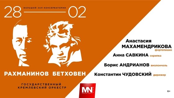 28 февраля в Большом зале Московской консерватории состоится концерт звезд классической сцены, посвященный великой музыке Людвига ван Бетховена и Сергея Рахманинова. В исполнении симфонического оркестра и одаренных солистов, обладателей первых премий многих престижных конкурсов Анастасии Махамендриковой (фортепиано), Бориса Андрианова (виолончель) и Анны Савкиной (скрипка) прозвучат музыкальные шедевры, вошедшие в золотой фонд классики. Среди них Соната для виолончели и фортепиано, Вокализ для скрипки и фортепиано, Элегическое трио соль минор для фортепиано, скрипки и виолончели Рахманинова, а также Концерт для скрипки, виолончели и фортепиано с оркестром Бетховена. Концерт пройдет в сопровождении Государственного Кремлевского оркестра, за дирижерский пульт встанет один из самых востребованных молодых российских дирижеров Константин Чудовский. Анастасия Махамендрикова (фортепиано) — студентка РАМ им. Гнесиных, ученица известного пианиста Владимира Овчинникова. Ее имя хорошо знакомо всем любителям классической музыки — Анастасия громко заявила о себе на многих международных и российских конкурсах и фестивалях: Первом международном юношеском конкурсе классического сольного исполнительства Nota Bene, X Международном юношеском конкурсе имени П.И. Чайковского, фестивалях «Хрустальное сердце мира», «Музыкальное восхождение», Grand Prize Virtuoso (Великобритания), Pietro Argent (Италия), имени А. Н. Скрябина (Франция) и многих других. Пианистка активно гастролирует в России и за рубежом, успев выступить на всех крупных площадках столицы, а также в самых престижных залах мира в США, Англии, Франции, Бельгии, Мальте, Италии, Белоруссии и Казахстане. Анастасия Махаменжрикова фото организаторов концерта "Подмосковные вечера" Борис Андрианов (виолончель) — заслуженный артист России (2016), преподаватель Московской государственной консерватории. В 16 лет стал лауреатом первого Международного юношеского конкурса им. П. И. Чайковского, а спустя год получил первую премию и Гран-при на конкурсе в ЮАР. Позже становился лауреатом многих престижных конкурсов, среди которых Первый Международный конкурс имени Д.Д. Шостаковича «Classica Nova» в Ганновере, VI Международный конкурс виолончелистов Мстислава Ростроповича в Париже, XI Международный конкурс имени П.И. Чайковского (III премия и Бронзовая медаль, 1998) и др. Художественный руководитель и идейный вдохновитель всероссийского проекта «Поколение звезд», автор идеи и арт-директор международных фестивалей Vivacello и Vivarte, художественный руководитель фестиваля «Музыкальная экспедиция». С 2005 года играет на виолончели работы Доменико Монтаньяно из Государственной коллекции уникальных музыкальных инструментов РФ. Анна Савкина (скрипка) закончила Московскую государственную консерваторию им. П. И. Чайковского (класс Владимира Иванова) в 2018 году, затем в классе того же педагога — ассистентуру-стажировку консерватории. В настоящее время совершенствует свое мастерство под руководством Эдуарда Вульфсона в Швейцарии. Лауреат многочисленных музыкальных конкурсов, среди которых Московский международный конкурс скрипачей им. Давида Ойстраха, Международный конкурс юных скрипачей им. Луи Шпора, Конкурс скрипачей им. Андреа Постаккини, Сендайский международный музыкальный конкурс, конкурс Astana Violin, Buchenau Spring и многих др
