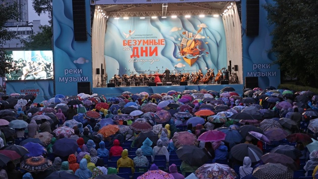 Водная феерия с фольклорным акцентом все же имела свою логику: тема нынешнего фестиваля - "Реки музыки", загадка зарождения музыки, поиски ее истоков. И кто-то там в небесной канцелярии услышал призыв, обрушив на Екатеринбург потоки воды, ураганный ветер и внезапное похолодание. Настоящим тестом на "святую к музыке любовь" и качественное безумие стали ежедневные концерты под открытым небом в саду Вайнера. Организаторы объявили: артисты готовы выходить на сцену - и призвали слушателей запасаться теплыми вещами, дождевиками и зонтиками. И, наверное, символом "Безумных дней-2024" станут фотографии сплошной "крыши" из 1600 зонтов - по числу кресел. Пустыми были единицы, люди стояли и в проходах.
