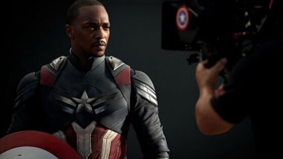 Серьёзный Энтони Маки в костюме Капитана Америка — на фото со съёмок фильма о герое