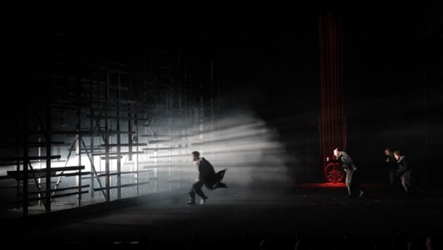 НЕ ДЛЯ СЦЕНЫ РОЖДЕННЫЙ Вообще, "Пугачев", написанный Есениным в самый разгар увлечения имажинизмом (да и посвященный имажинисту Мариенгофу) , представляет собой, по сути, несколько очень ярких, может быть, местами и гениальных, но очень мало связанных друг с другом монологов и диалогов. Так же ль он в полях своих прилежно Цедит молоко соломенное ржи? Так же ль здесь, сломав зари застенок, Гонится овес на водопой рысцой, И на грядках, от капусты пенных, Челноки ныряют огурцов? - интересуется заглавный герой в самой первой сцене. Это он насчет мужицкой жизни, но запоминаются, натурально, только огурцы. И так везде. Вообще, конечно, для сцены эта вещь "в чистом виде" непригодна. "Не знаю, бывали ли когда такие трагедии. Кроме Пугачёва, никто в моей трагедии почти не повторяется: в каждой сцене новые лица. Это придает больше движения и выдвигает основную роль Пугачёва", – признавался сам Есенин. Говорят, сам Мейерхольд не придумал, как вывести "Пугачева" на сцену. Юрий Любимов на Таганке – придумал. 55 лет спустя после написания, в 1967 году. Фото: © Денис Жулин Нам, конечно, сразу вспоминается монолог каторжника Хлопуши, сподвижника легендарного бунтаря, в исполнении Высоцкого. Помните? Приведите меня к нему, Я хочу видеть этого человека. Есть видеозапись – и действительно, это ни на что не похоже. "Это не монолог драмы, а какая-то речитативная ария, необычная песня, но без смягчающего песенного размера и лада. Ритм диктуется не чередованием ударений, а переливами душевных движений", - писала критик Наталья Крымова. Есть и знаменитая фонограмма – монолог Хлопуши читает сам Есенин. Гениально читает, если что. Высоцкий был с записью знаком, но сделал по-своему. Сам спектакль, судя по описаниям и постановщика, и актеров (сохранились, конечно, и фото) помимо текста Есенина, включал фольклорный элемент и сильную символичествую сторону – та самая "плаха с топорами", изготовленная Давидом Боровским, была доминантой. Виселицы. Дерюга. Цепи (актеры жаловались на постоянные занозы от всего натурального). Плюс связывающие действие интермедии Николая Эрдмана (с императрицей Екатериной и разными смыслами, включая намеки на актуальные советские дела), позволяющие держать материал, что называется, в узде (Любимов сомневался, что публика выдержит двухчасовой напор поэтической стихии). Плюс комментарии к происходящему от скоморохов (речитатив авторства Высоцкого!). Такое вот дополнение к есенинскому тексту. Ну и актеры какие – Николай Губенко (Пугачев), Борис Хмельницкий, другие, весь золотой состав Таганки. Ставить "Пугачева" и сейчас, почти 60 лет спустя, не оглядываясь на ту постановку, невозможно. Федор Малышев и оглядывается. На многое, вообще, оглядывается. ПЕСНИ И ПЛЯСКИ НАРОДОВ МИРА Малышеву чуть больше 30-ти, но он на сцене Мастерской Фоменко поставил уже не один спектакль (ставил и в соавторстве со своей женой, Полиной Агуреевой). Пушкин. Гоголь. Булгаков. Не шутка! И это не говоря об активной актерской работе (включая сериальную). Критика встречала его постановки по-разному. Да они и были разными. Например, "Мастер и Маргарита" (как раз сорежиссура с Агуреевой) – по мне, скорее, неудача. А вот про "Пугачева" так не скажешь. Самое главное, постановщик нашел подход к тесту, создав на его основе яркое фольклорное шоу. При этом историософские материи, столь важные для Есен