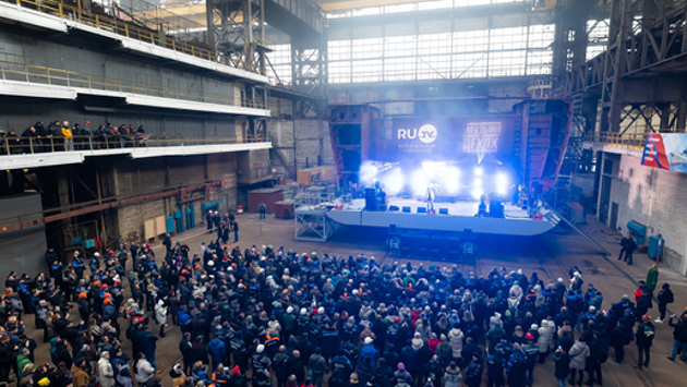 Концерт называется «Музыка в цехах», и это факт: зрители собираются в огромном ангаре, где строят научно-исследовательское судно. Импровизированную сцену устроили под одной из секций.