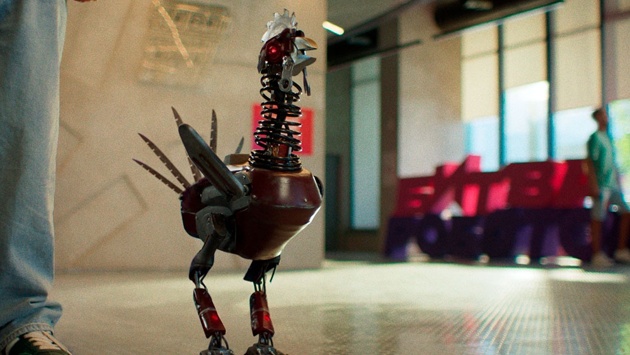 Изображение демонстрирует противостояние главных героев: молодого айтишника (Денис Власенко), пытающегося вырваться из тени криминального прошлого своей семьи, и "нейробати" - механизированного петуха с пилой вместо хохолка и горящим красным глазом.