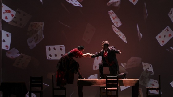 Хотя после антракта "Игроки" начинаются темпераментно и многообещающе: дама в красно-черном платье страстно отплясывает в стиле "мечтаю о Кармен, но согласна и на "Травиату" и раскидывает колоду карт, будто пытается побороть тайную недоброжелательность... Так по режиссерскому замыслу на сцене оживает и персонифицируется колода карт с женским именем Аделаида Ивановна. Все игроки - шулеры: каждый жульничает, как умеет, и играет краплеными картами. В нынешнем представлении всё строится лишь на одержимости к игре, которая требует разорить и уничтожить любого противника.