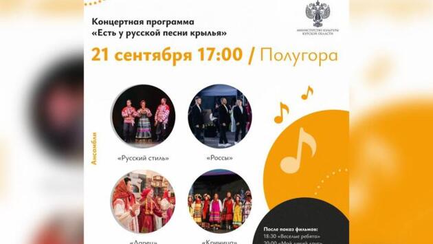Мероприятие состоится 21 сентября в 17:00 на Полугоре. В этот вечер выступят коллективы и солисты Курской филармонии: ансамбли «Русский стиль» и «Россы» (руководитель Виктория Прохорова), гармонист Дмитрий Шилов, Анна Сидоренко. В 18:00 выступят фольклорный ансамбль «Ларец» Курского областного Дома народного творчества и фольклорный инструментальный ансамбль «Криница». В 18:30 начнется показ музыкальной комедии «Веселые ребята» 1934 года, а в 20:00 покажут фильм «Мой дикий друг» (2024). Возрастное ограничение 0+.