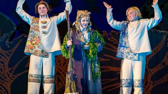 Вот когда рак свиснул, тогда и началась эта история. Жил-был царь Аггей, и родился у него первенец. И у ключницы Варвары появился мальчик, и в капусте третьего нашли… Всех и нарекли одинаково – Иванами. Да только Варвара лишь родному сыну возжелала счастливой судьбы наследника царства Аггея – подменила братьев, отправив двух к брату своему на мельницу – пусть-де те работают, а моему царство впридачу. Парень-то, конечно, не дурён собой, но красуется постоянно в зеркало, делать ничего не хочет, лень ему. Поскорей бы царство-государство получить! Да только по прошествии двадцати лет царь Аггей готов был только полцарства в наследство отдать, а остальную половину получит тот, кто сможет освободить царевну Милолику (Анна Кармакова) из заточения у Кощея Бессмертного. Много забавных приключений и сложных испытаний предстоит пройти Иванам, прежде чем освободят они прекрасную царевну. И как в каждой доброй сказке зло будет наказано, а добро победит. Фото: Владимир Майоров Сказка и впрямь получилась живой, выразительной, с юмором, яркой и красочной. Удались все роли – и царя Аггея (Олег Пышненко), и настоящего Ивана-Царевича (Кирилл Чернышенко), и его двух братьев – Ивана-Подкидыша (Назар Сафонов), и Ивана Варварина (Николай Кисличенко). Не оставила равнодушной и игра исполнительницы роли Варвары – Натальи Корогодовой. Её Варвара-ключница – мать, слишком заботящаяся о благополучии собственного дитяти, и ради его же счастья способная на подлог. Дама яркая и эксцентричная, недалёкая, но удивительно обаятельная! Фото: Владимир Майоров И, конечно, очень обаятельным (а как же иначе!) получилось зло. Кощей Бессмертный (Сергей Миллер) – чародей настолько коварный – всех желающих освободить царевну Милолику превращает в деревья, насколько же и смешной, пластичный (даром что из костей сделан). А кроме того он азартный, и сказки слушать любит – есть же и в нём человеческое! Такого и победить можно, и смерть его найти, и всех освободить! И помощники найдутся. Фото: Владимир Майоров Первой придёт на помощь Баба-Яга (Ирина Бякова), предстающая перед зрителями в образе рокерши. И не старая совсем, а талантливая – на гитаре играет, поёт. А гитара-то непростая – с веточками из метлы! Одинокая Баба-Яга на болоте, сторожит вход в царство Кощеево. Одинокая, но не злобливая, а очень даже заботливая – не пожалела для двух Иванов летучий ковёр, который помог найти Жар-Птицу (Екатерина Рогачкова) у шаха Бабадура (Александр Анисимов) и привезти её Кощею. Исплнение роли Бабы-Яги требует немалого мастерства и умения. И Ирина Бякова сыграла отлично, превзойдя все ожидания зрителей, о чем свидетельствовали долгие апплодисменты. Фото: Владимир Майоров "Три Ивана" – чудная и добрая сказка, красочная – спасибо художнику-постановщику Анастасии Александровой. Всё передано лаконично, выразительно, а главное остроумно и по-доброму. Кто подумает, что царство Аггея маловато, если он возит его за собой на велосипеде? Костюмы Иванов и платье царевны Милолики яркие, выполнены в русском стиле. Спектакль отличает единение игры и декораций и, конечно, дивных песен на музыку Г. Гладкова на стихи Ю. Кима. Фото: Владимир Майоров