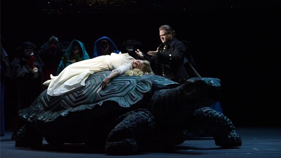Вустин настолько не верил в возможность постановки, что даже не набрал партитуру: её срочно печатали перед премьерой. Постановка стала возможна в результате счастливого стечения обстоятельств. Дирижер Владимир Юровский, сделавший Вустина композитором–резидентом Госоркестра имени Светланова, и режиссёр Александр Титель независимо друг от друга проявили интерес к опере. Так звёзды и сошлись. В подзаголовке партитуры сказано, что это "сцены для голосов и инструментов". Друг Вустина, артист и драматург Владимир Хачатуров, восхищенный "готической" повестью Жака Казота (1772), где, по давней европейской традиции, женщина, соблазн и дьявол – это синонимы, написал либретто и принёс композитору. Тот восхитился в свою очередь, и не только коллизиями сюжета самого по себе, или скрытой и явной иронией текста. Но и возможностями, которые эти коллизии и эта ирония давали для новой композиторской техники, увлеченно изученной и принятой Вустиным. В самом деле, какую еще музыку, как не додекафонную (то есть, по восприятию широкой публики – загадочную, неблагозвучную и непонятную), писать в связи с мистической историей о нечистой силе? Согласно Казоту и либретто, некий испанский капитан Альвар, служивший в Италии, стал из любопытства чернокнижником и неосторожно вызвал дьявола, а тот, чтобы завоевать человеческую душу, взял, да и прикинулся юной красавицей. Надев маску лжи, похожей на правду, дама сперва прикидывается послушной девой воздуха, но постепенно начинает повелевать, подавляя волю и заставляя Альвара забыть, что сперва была вообще-то уродливым верблюдом. Герой при этом наивно думает, что всегда может освободиться от искушения, как наркоман долго уверен, что всегда сможет бросить. Конечно, девица в итоге соблазняет героя, чтобы… Ну, все знают, зачем дьявол нас искушает. Дон Альвар – А. Росицкий, Бьондетта – Д. Терехова. Фото: © С. Родионов В общем, совпадение принципов и эмоций налицо: кругом сплошные диссонансы, что в оркестровой яме, что в душе героя. При этом додекафония Вустина – не "умственная" и не сухая. В ней взвинченность и резкие переходы. Как смена наших настроений и намерений. Внезапные всплески и опадания высотности как кипение мятущейся души. А главное — ситуационная логика, и там, и тут. В неоготическом по духу сочинении задействованы многие приемы музыки двадцатого века, ставшие фирменным почерком Вустина: необычные тембры, невиданные (точнее, не слышанные) акустические эффекты, нетрадиционное использование традиционных инструментов. Конечно, нестандартный состав оркестра: одна скрипка, один контрабас, ни одного альта и виолончели, две разных флейты и два кларнета, труба и тромбон. Три саксофона – альт, тенор и баритон. Четыре клавишных — фортепиано, челеста, орган и клавесин, не считая синтезатора. Повышенная роль ударных, их семь, в том числе гонг, тамтам, коробочки и совсем уже редкая "кихада" — трещащий инструмент из челюсти осла. Двенадцатикратная "чистая" додекафония и мелодекламация в опере не довлеют совсем уж тотально. Есть намеки на разное, от танго до баркаролы, от марша до фанданго. И понятно, почему. Все же это опус в жанре волшебной страшной сказки. С местом действия в Венеции и Испании. Со свадьбой и карнавалом, дуэлью и страстью. Так что потребно разнообразие. …Дьявол в опере — не новая тема. Все знают " Фауста" Г