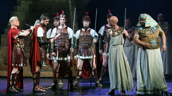 За несколько десятилетий до нашей эры в Египте, ожесточенном распрями и войнами, словно цветок на поле брани расцвела история этой странной любви, давшая жизнь множеству литературных и музыкальных произведений, кинофильмов, а теперь еще и мюзиклу, созданному одним из лучших композиторов, работающих в этом жанре Александром Журбиным. Либретто мюзикла, как и стихи, написаны Жанной Жердер при участии Александра Журбина по одноименной пьесе Бернарда Шоу. Премьера мюзикла приурочена к юбилею народного артиста России Герарда Васильева, который и сыграет Цезаря. В роли Клеопатры московский зритель увидит одну из ведущих актрис Московского театра оперетты Василису Николаеву.