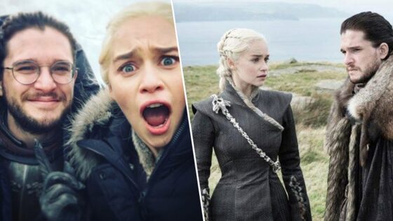 Семья Старков ещё вся в сборе. Это ли не повод радоваться началу семейной эпопеи длиною в 8 сезонов? Арья и Бран Старки, видимо, не очень довольны участью, которую подготовили для них сценаристы «Игры престолов». Если ты злодей Джейме Ланнистер, которого держат в заточении, это ещё не повод не отмечать свой день рождения. Когда снимали этот эпизод, актёр Николай Костер-Вальдау был именинником. Это только в сериале не все Ланнистеры хорошо ладят между собой. В жизни же у актёров тёплые отношения. А Лина Хиди и вовсе получила роль в «Игре престолов» благодаря актёру Питеру Динклэйджу. Артисты дружат в жизни, и Питер, сыгравший Тириона, предложил Лину на роль Серсеи. Бесстрашный Джон Сноу на драконе выглядит впечатляюще. А на съёмочной площадке эффектные кадры снимают так. Санса Старк не зря заметила, что для армии северян маловато еды. Видимо, по распоряжению королевы Севера в Винтерфелл завезли трактор для поднятия целины. Кажется, что суровых одичалых не испугать снегом. Но лидер вольного народа Тормунд не смог отказаться от такого инновационного изобретения, как зонт. Да, это Дейенерис Бурерождённая, Матерь Драконов, разрушительница оков, которая приводит в трепет соперников. Пусть в сериале волосы у неё в огне не горят, но это не значит, что и вода не нанесёт им никакого вреда. Эта милая парочка натворила много странных дел в Вестеросе. Отношения у Джона Сноу и Дейенерис Таргариен закончились печально, а в жизни актёры Кит Харингтон и Эмилия Кларк дружат. В сериале царит напряжённая атмосфера, но это не мешает актёрам делать между дублями забавные фотографии. Они тоже люди и могут радоваться окончанию рабочего дня.