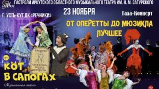 Артисты Иркутского областного музыкального театра им. Н.М. Загурского 25 ноября вернулись из гастролей в Усть-Кут. Коллектив из 32 человек выступил на сцене дома культуры «Речники», сообщила 27 ноября пресс-служба театра. Спектакли иркутян посетили около 700 зрителей. Так, 23 ноября маленькие зрители посмотрели музыкальную сказку «Кот в сапогах». А вечером состоялся показ гала-концерта солистов театра «От оперетты до мюзикла. Лучшее»: зрители насладились вокальными и танцевальными мировыми хитами из рок-опер, оперетт и мюзиклов. В прошлый раз артисты музыкального театра на гастролях в Усть-Куте были семь лет назад – в 2012 году. В октябре коллектив музыкального театра вернулся из Москвы, где на фестивале «Видеть музыку» показал современную оперу «Две королевы». А в настоящий момент труппа готовится к двум предновогодним премьерам: классическому балету П.И. Чайковского в постановке народного артиста СССР Вячеслава Гордеева и музыкальной сказке М. Дунаевского «Летучий корабль» белорусского режиссера Анастасии Гриненко. Премьера балета «Щелкунчик» состоится 13 и 14 декабря, а премьера музыкальной сказки «Летучий корабль» – 21 декабря.